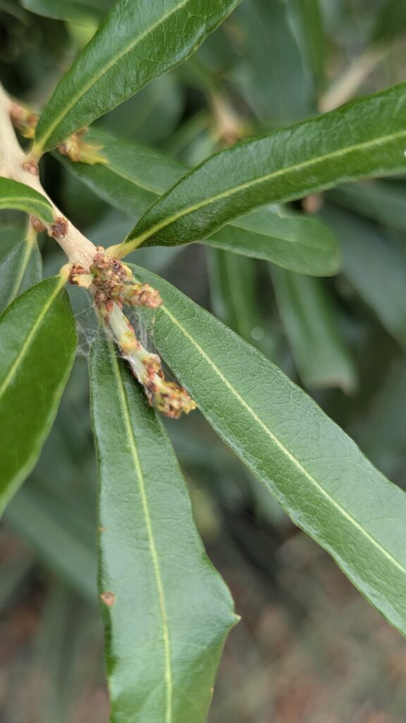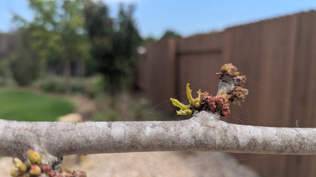 - Fine white webbing at the tips of branches or buds